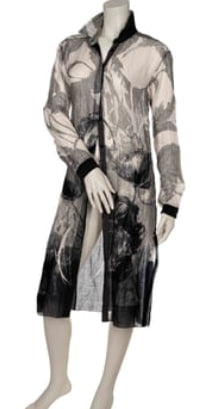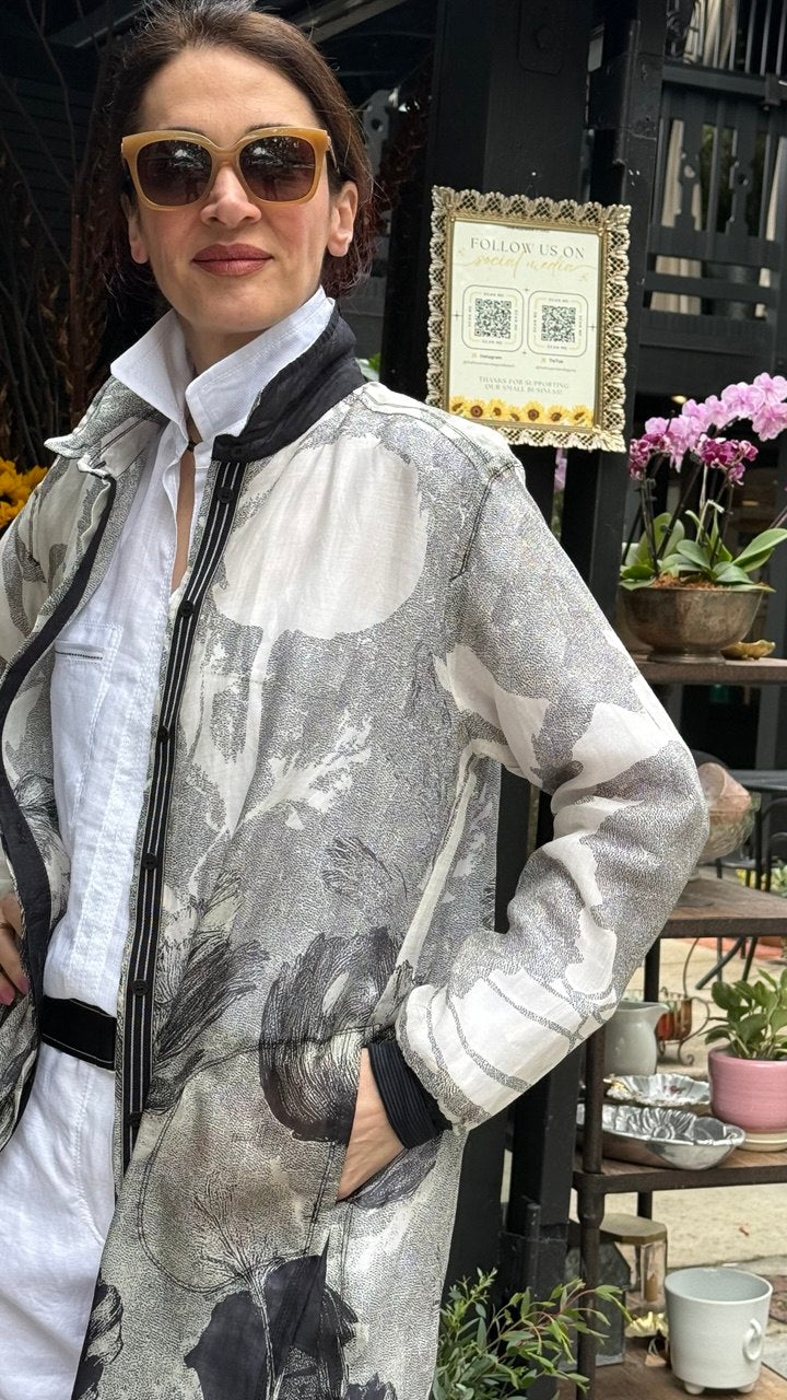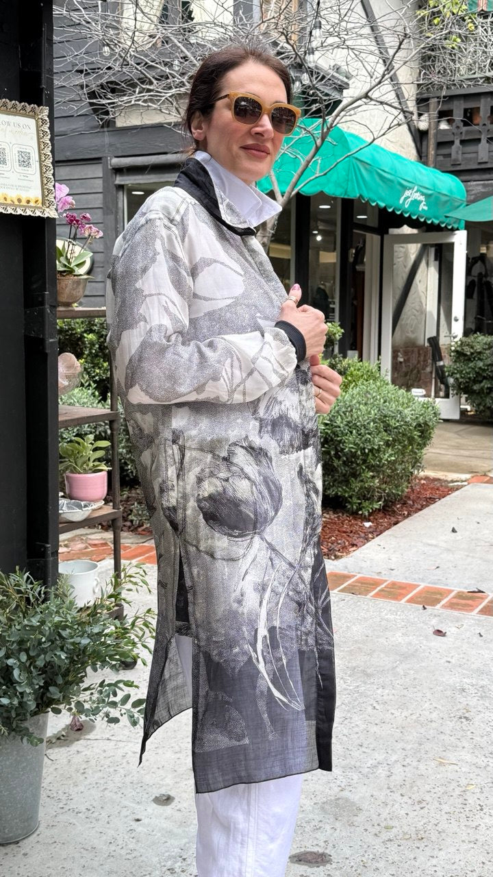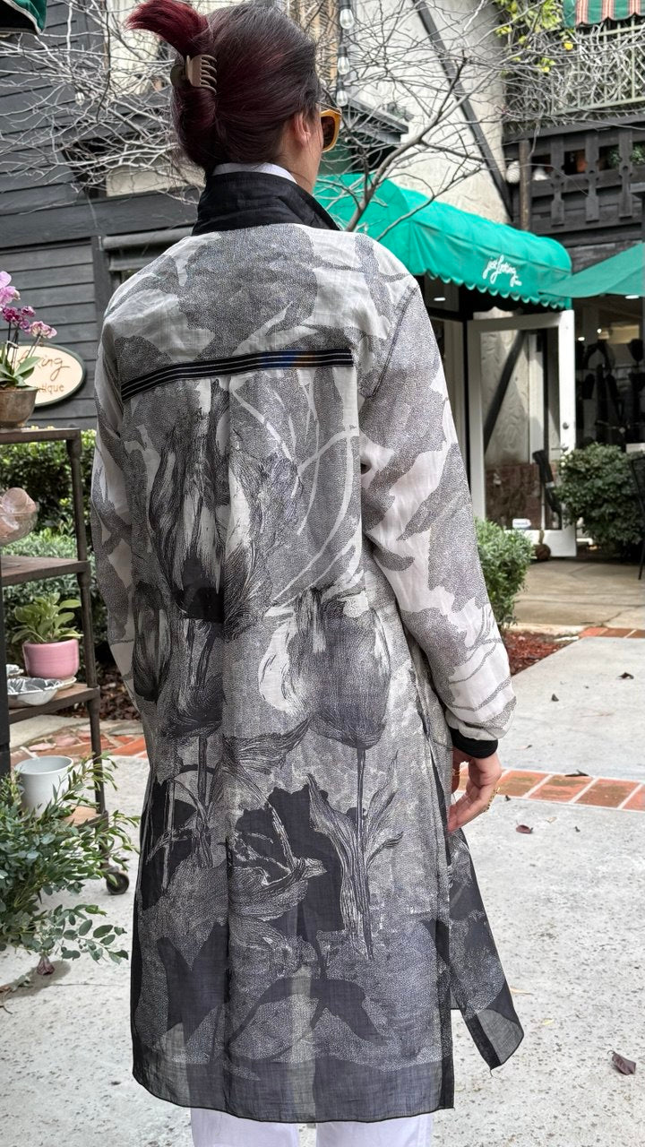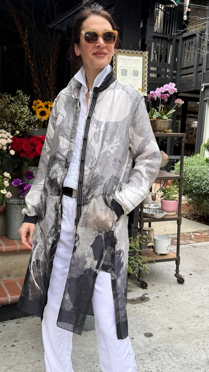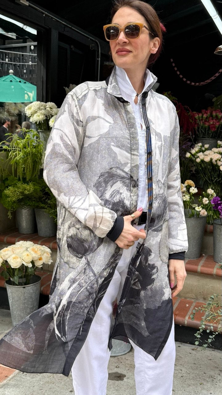 Beate Heymann's duster blouse commands attention with its striking black and white colorway and contemporary design sensibility. Crafted from breathable ramie fabric, the piece delivers an intentional sheer quality that adds visual intrigue while maintaining wearability. Elasticized cuffs anchor the extended sleeves, while the generously cut silhouette provides ease of movement without sacrificing polish. A sophisticated layering piece that bridges the gap between statement wear and everyday versatility.
