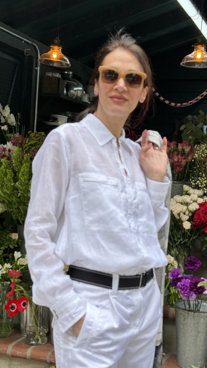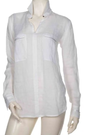 Beate Heymann's linen mix blouse exemplifies refined tailoring with its structured V-neck design secured by hook and eye closure. The expertly crafted silhouette features front and back pleats that enhance movement, while breast pockets trimmed in tonal silky ribbon tape add sophisticated detail. Deep cuffs finished with matching tape and metal rectangular poppers ensure durability and polish. A striking black stitch tape runs across the back, complementing the hi-lo hem and cut-out sides for contemporary edge. This versatile piece transitions seamlessly from professional settings to elevated casual wear.