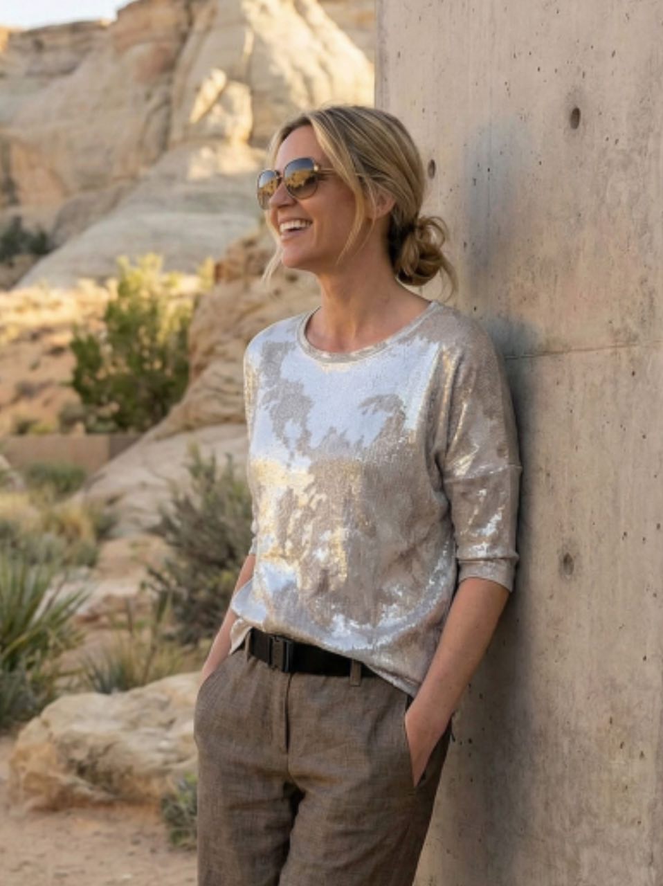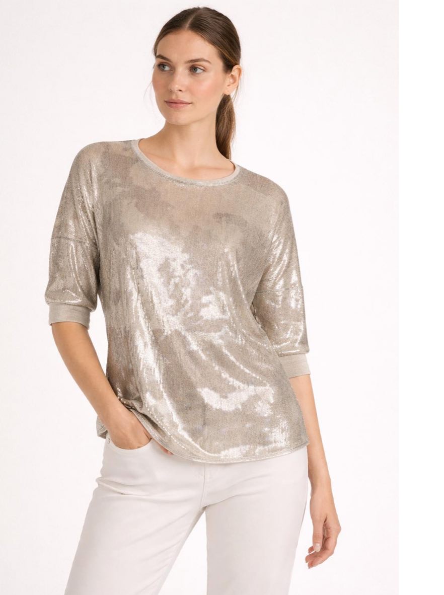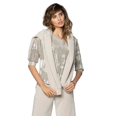 Beate Heymann's Top 301 exemplifies refined minimalism with its off-white base and striking black graphic elements. The round neckline features elegant black piping and a centered front slit, while a vertical stripe creates a lengthening effect down the front. An adjustable tie at the hem offers versatility—wear it loose for effortless flow or cinch it for a more tailored silhouette. The clean back with its fine center seam completes this sophisticated piece, seamlessly transitioning from casual to polished occasions.