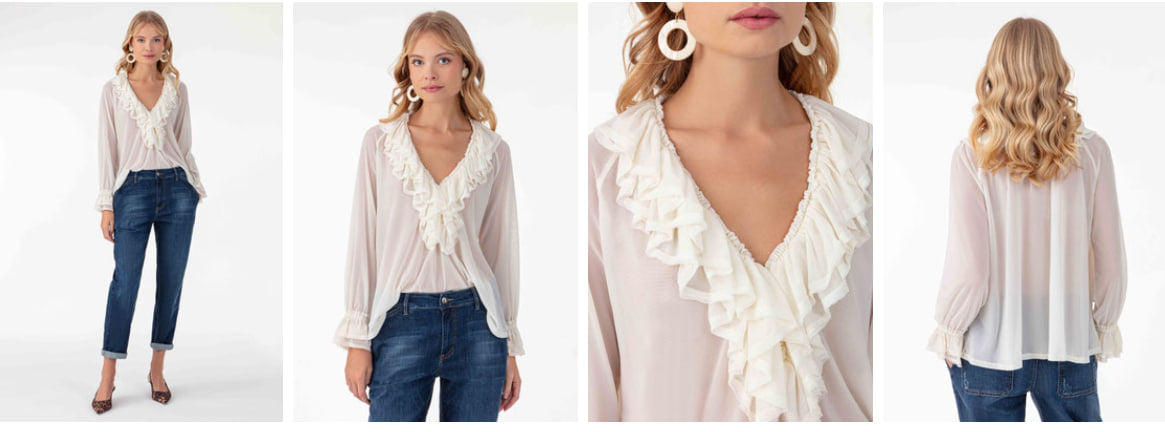 The Indies 25H Blouse showcases an elegant cream hue crafted from a light, flowing fabric that drapes softly for a polished look. Its deep V-neckline is delicately trimmed with a cascading ruffle, adding a romantic touch, while the long sleeves feature subtle puffing and gathered cuffs, enhancing the blouse’s refined silhouette. Perfect for sophisticated styling with a gentle, feminine appeal.