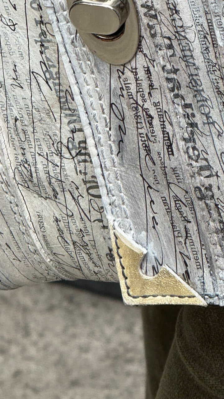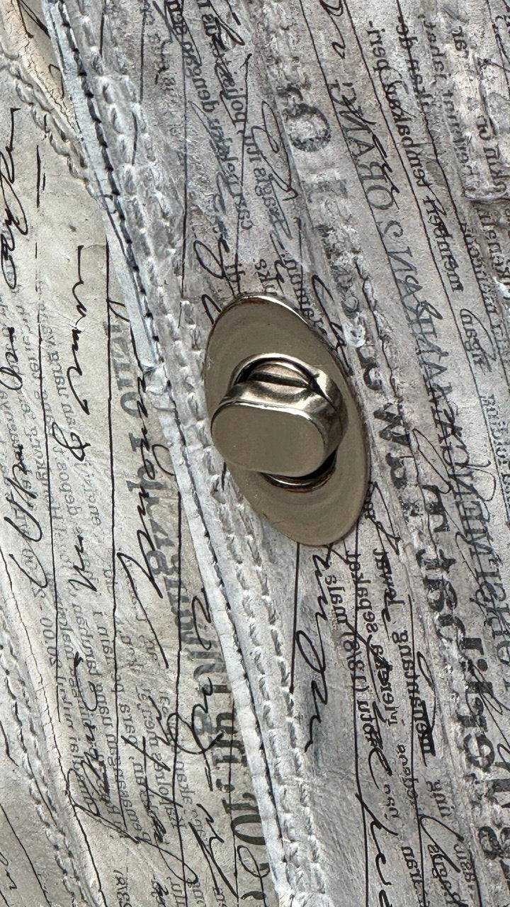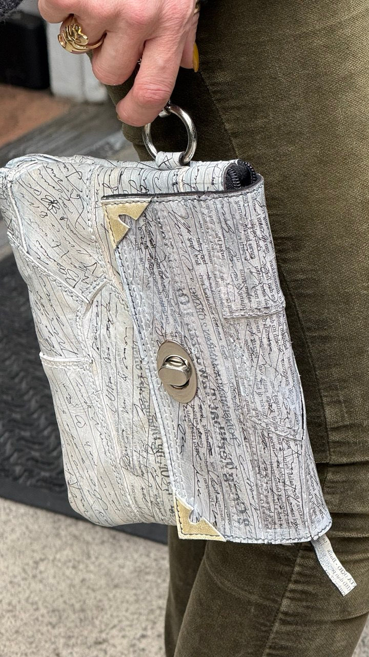 Discover our Handmade Boho Wristlet, where sustainability meets artistic expression. Crafted from recycled leather sourced from local furniture offcuts, each piece diverts waste from landfills while delivering distinctive style. Hand-cut and hand-painted with striking handwriting and newspaper motifs, no two wristlets are identical. This lightweight accessory transitions seamlessly from weddings to everyday wear, offering both versatility and visual impact. Perfect for the environmentally conscious consumer seeking meaningful, artisan-quality pieces that tell a story.