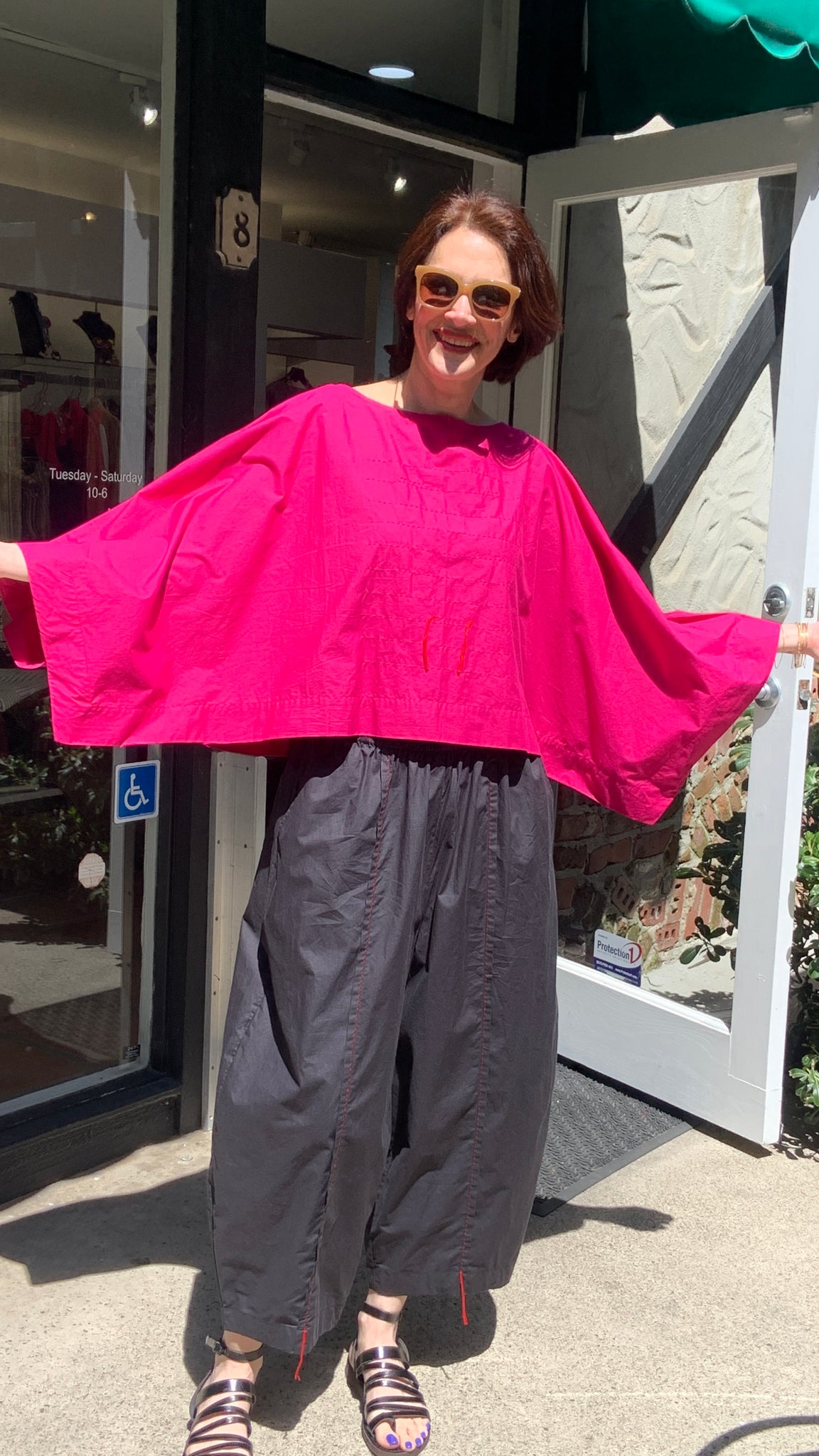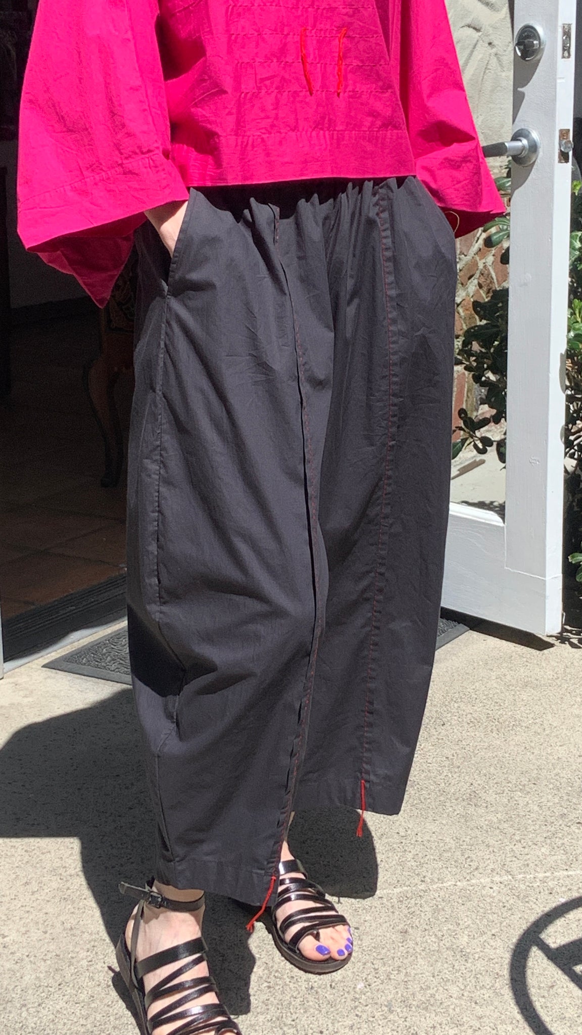 Kedem's W107 pants deliver distinctive style through thoughtful design details. Crafted in classic black, these pants feature bold topstitching on the pocket and striking red accent stitching at the cuffs and pocket edges—signature elements that elevate everyday wear. The intentionally uneven cuff length adds an avant-garde touch, creating visual interest and modern appeal. Perfect for those who appreciate fashion-forward pieces with character and craftsmanship.