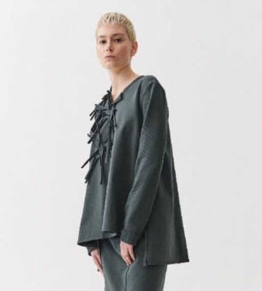 The Kedziorek Aline tunic top showcases a sophisticated silhouette that balances structure with fluidity. Crafted from matte, medium-weight fabric, it offers an elegant drape that enhances its shape. Featuring a round neckline detailed with an artistic arrangement of knotted fabric strips, this long-sleeved design finishes with a gently flared hemline, combining refined craftsmanship with modern style. Ideal for elevating both casual and dressier looks.