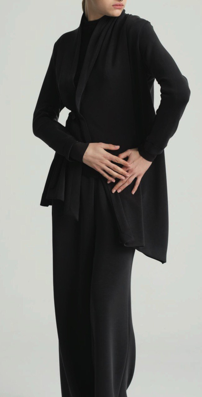 The Lotus Savak jacket offers a sophisticated mid-length silhouette with a wrap-over design and asymmetrical hem that adds modern flair. Smooth vegan leather inserts on the sleeves and back provide a refined contrast in texture, while the sleeves feature double cuffs for an elevated finish. This jacket combines contemporary style with thoughtful detailing, perfect for layering with tailored or casual outfits.