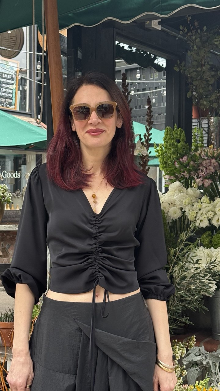 Effortlessly chic black top featuring a flattering ruched front with adjustable drawstring for a customized fit. The soft V-neckline and three-quarter sleeves with gathered cuffs create a refined silhouette that complements any look. Crafted from smooth, lightweight fabric that drapes beautifully, this cropped length pairs perfectly with high-waisted bottoms for seamless day-to-evening styling. A versatile wardrobe essential that balances minimalist design with modern sophistication.