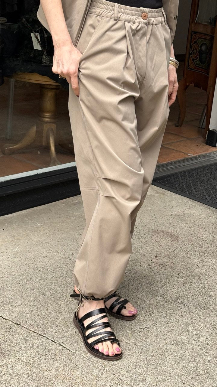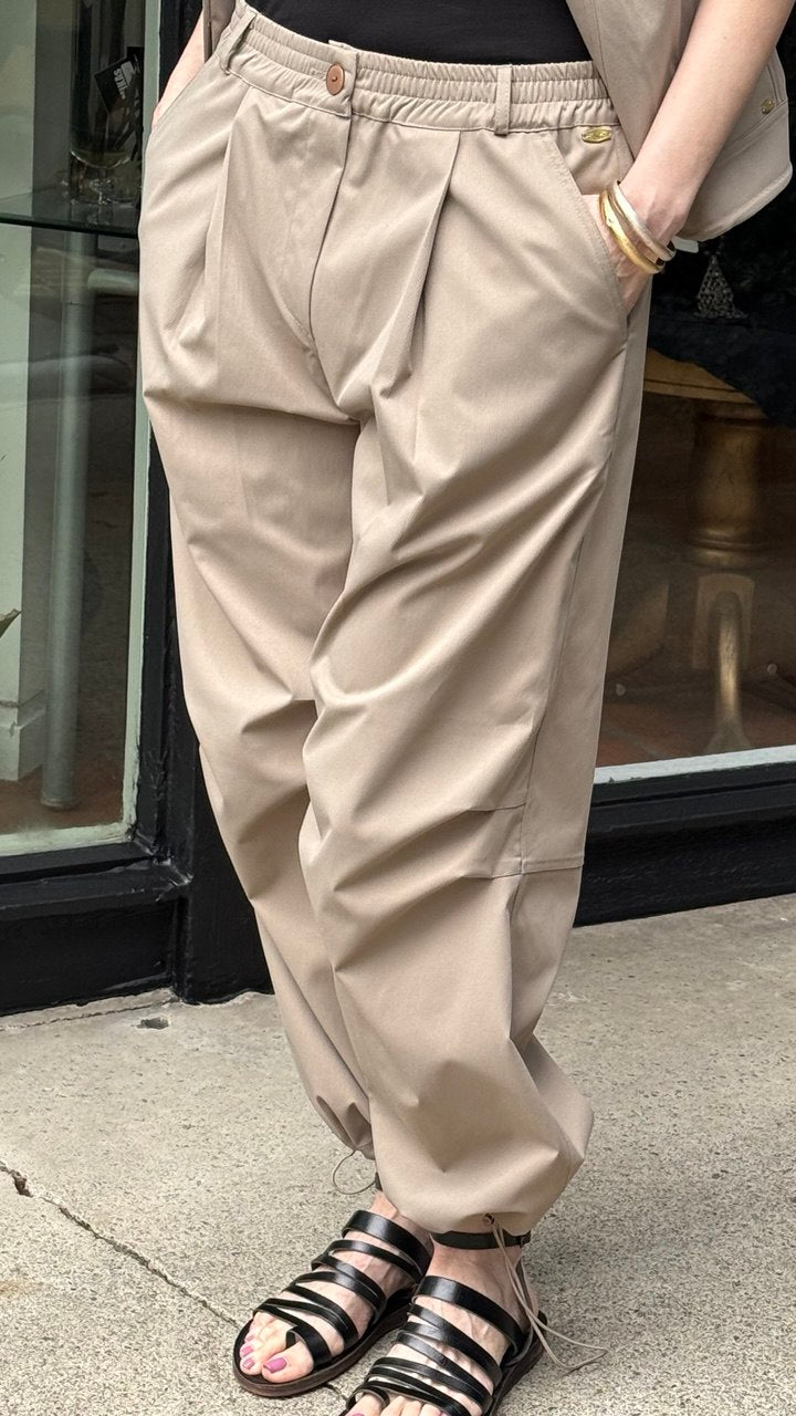 Effortlessly modern and incredibly comfortable, these relaxed-fit Lozzee pants blend tailored style with everyday ease. Featuring a soft elastic waistband, button closure, and subtle front pleats, they deliver both flexibility and structure. The tapered leg creates a flattering silhouette while the lightweight, smooth fabric drapes beautifully and feels great all day. Functional side pockets and minimal detailing keep the look refined and versatile—dress them up with heels or wear casually with sandals. A timeless neutral essential that pairs seamlessly with cropped tops, lightweight knits, or tailored jackets for effortless, chic styling.
