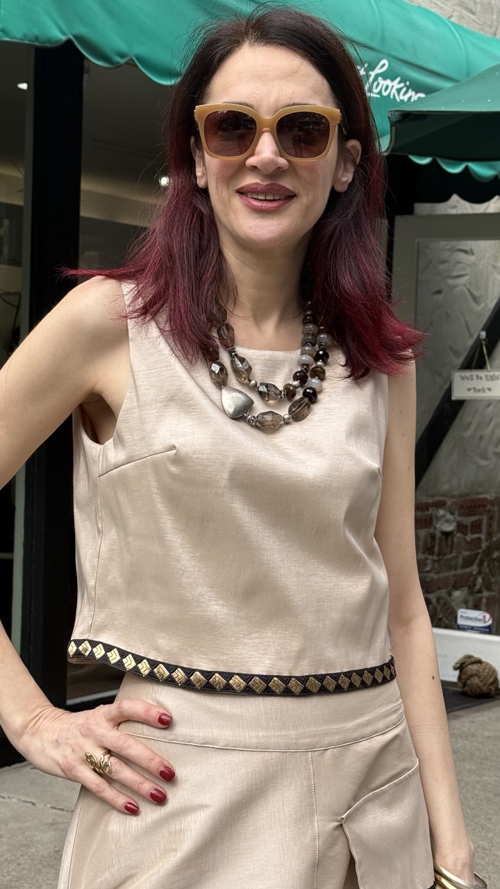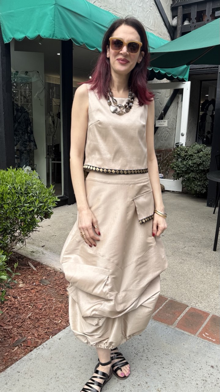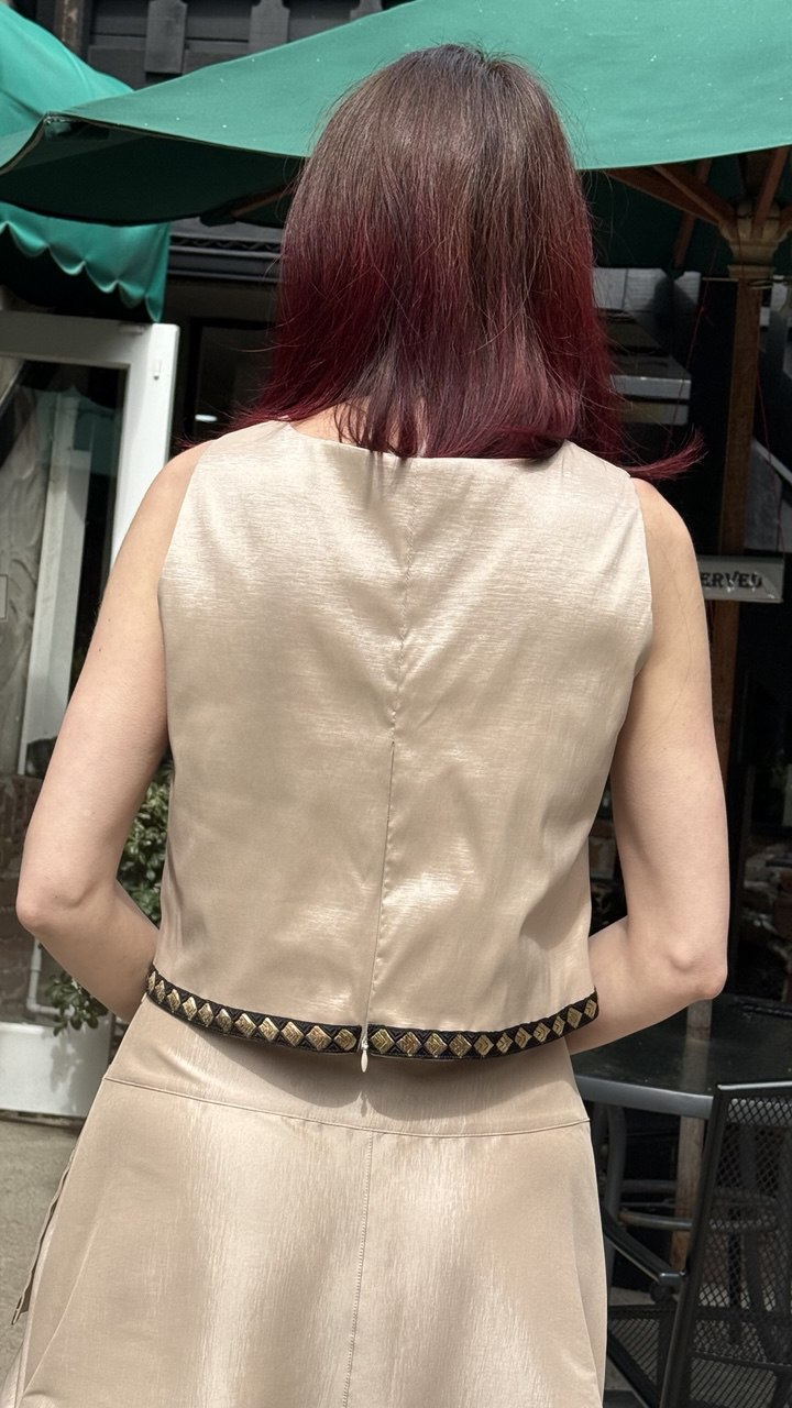 Understated elegance meets modern edge with this sleeveless Lozzee crop top. Crafted from soft, luminous fabric with a subtle sheen, it features a clean round neckline and tailored structure for a polished silhouette. The cropped cut pairs seamlessly with high-waisted bottoms, while a distinctive geometric trim at the hem delivers a bold graphic accent. Lightweight and versatile, this piece transitions effortlessly from day to evening, whether styled with matching separates or contrasting textures for a contemporary, elevated look.
