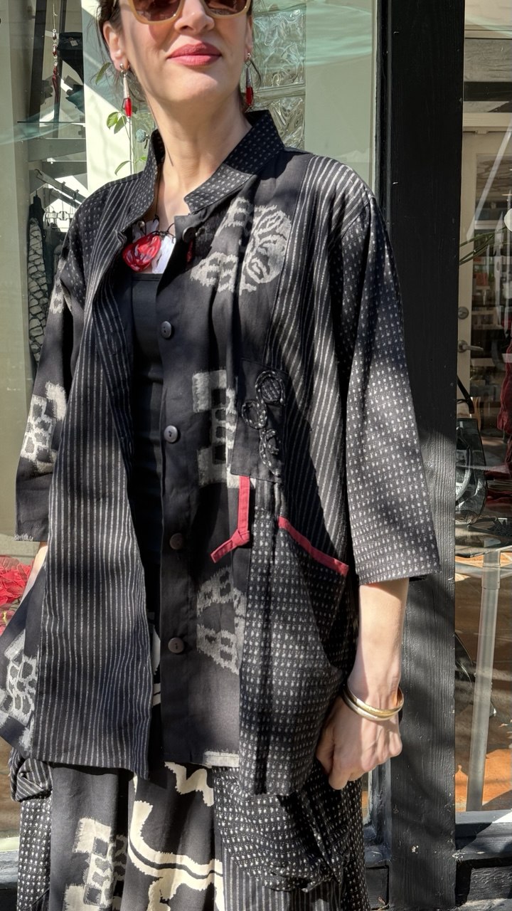 Pure Fit's Kasury Patch jacket combines contemporary tailoring with artistic design. The mandarin collar and two front pockets deliver functional sophistication, while the patchwork construction showcases geometric precision—bold stripes and circles in black and grey, accented with vibrant red ribbing. This statement piece merges structured fit with creative pattern work, ideal for those seeking distinctive style with wearable elegance.