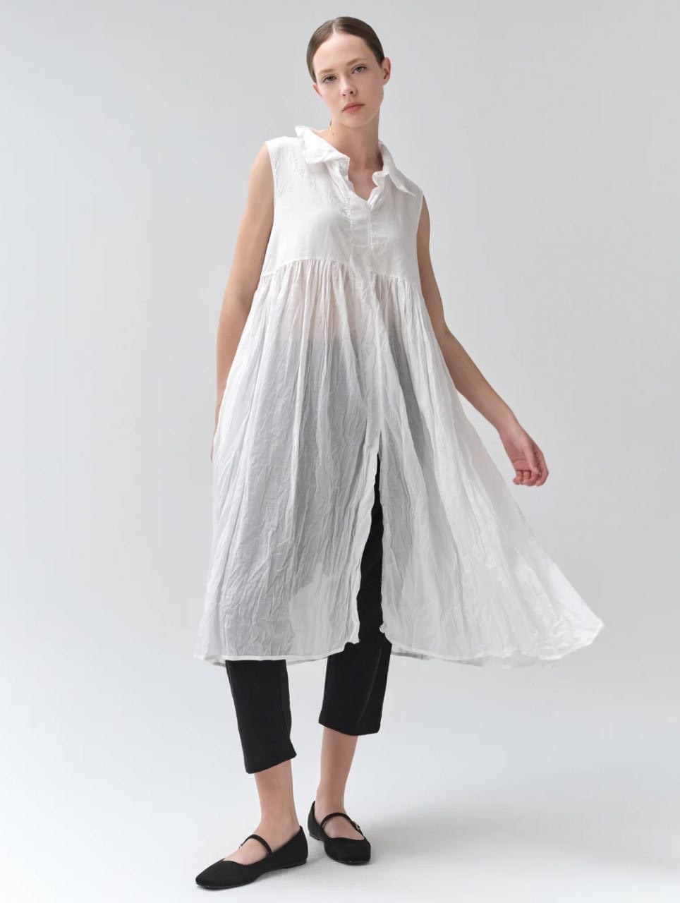 This Igor tunic is a beautifully fluid piece designed for ease, movement, and quiet sophistication. Crafted in a lightweight fabric, it features a relaxed, A-line silhouette that drapes effortlessly away from the body, creating a soft, airy feel with every step. The sleeveless design and subtle notch neckline add a refined touch, while gentle gathering through the front enhances its volume without overwhelming the shape. The asymmetrical hemline and front slit introduce movement and dimension, allowing it to layer seamlessly over slim pants or leggings. Clean, modern, and effortlessly wearable, this tunic is perfect for those who want comfort without sacrificing style.