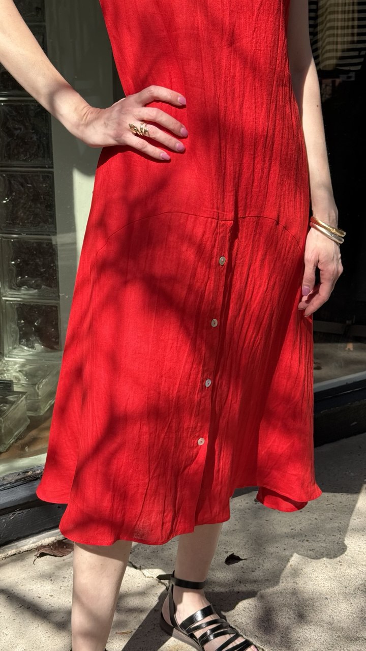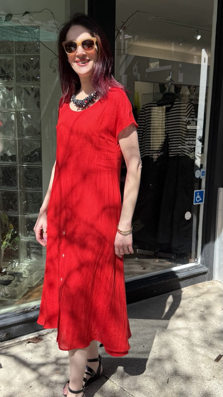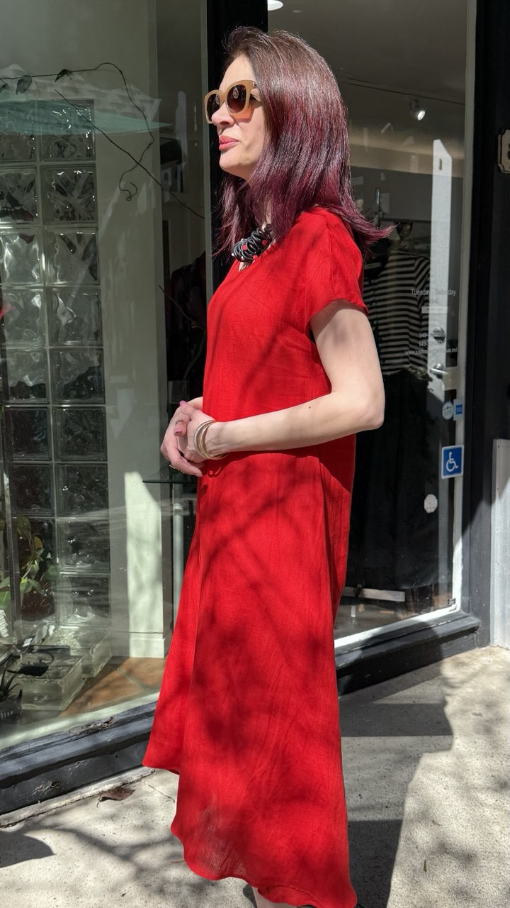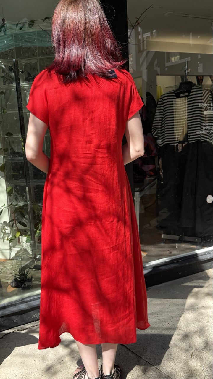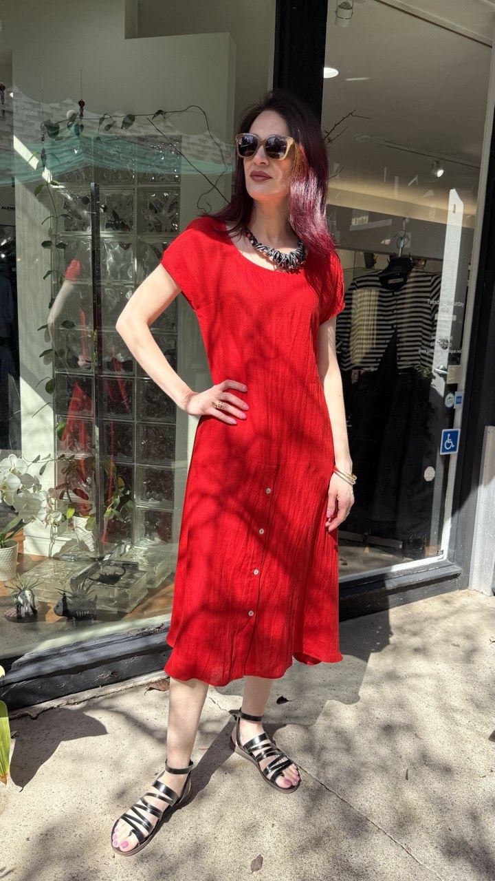 Replika's R5 dress combines timeless elegance with practical design. This full-length silhouette features a buttoned front from the waist down, allowing for effortless styling versatility and easy layering. The short cap sleeves provide refined coverage while maintaining a graceful, feminine aesthetic. Crafted with attention to detail, this piece transitions seamlessly from day to evening wear, making it an essential addition to any sophisticated wardrobe.