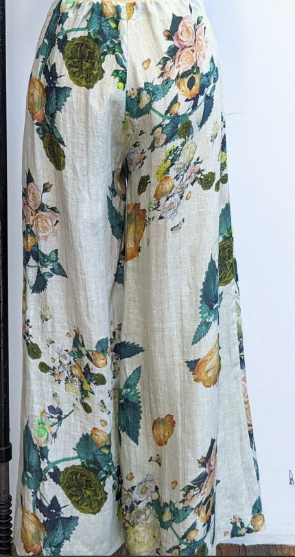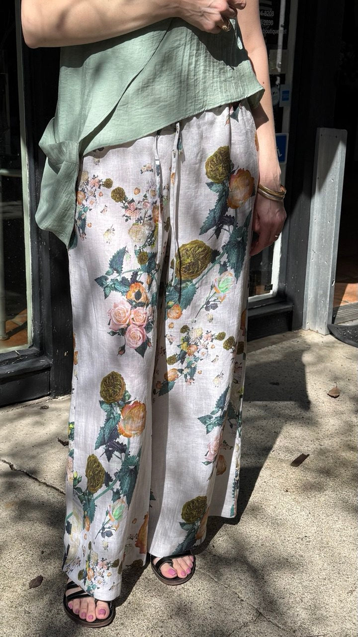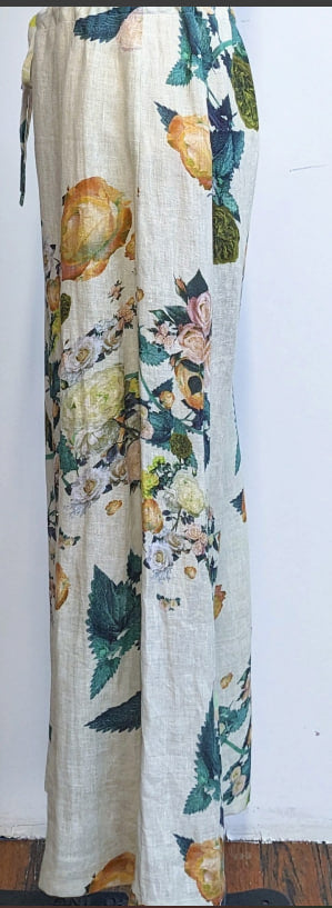 Replika's linen pants feature a relaxed, loose silhouette perfect for warm-weather versatility. Crafted from natural linen, these pants offer breathable comfort and a refined drape that works equally well for casual outings or elevated everyday wear. The drawstring waist provides adjustable fit and an effortless aesthetic. The subtle floral pattern adds visual interest while maintaining the understated elegance linen is known for. An investment piece that transitions seamlessly across seasons.