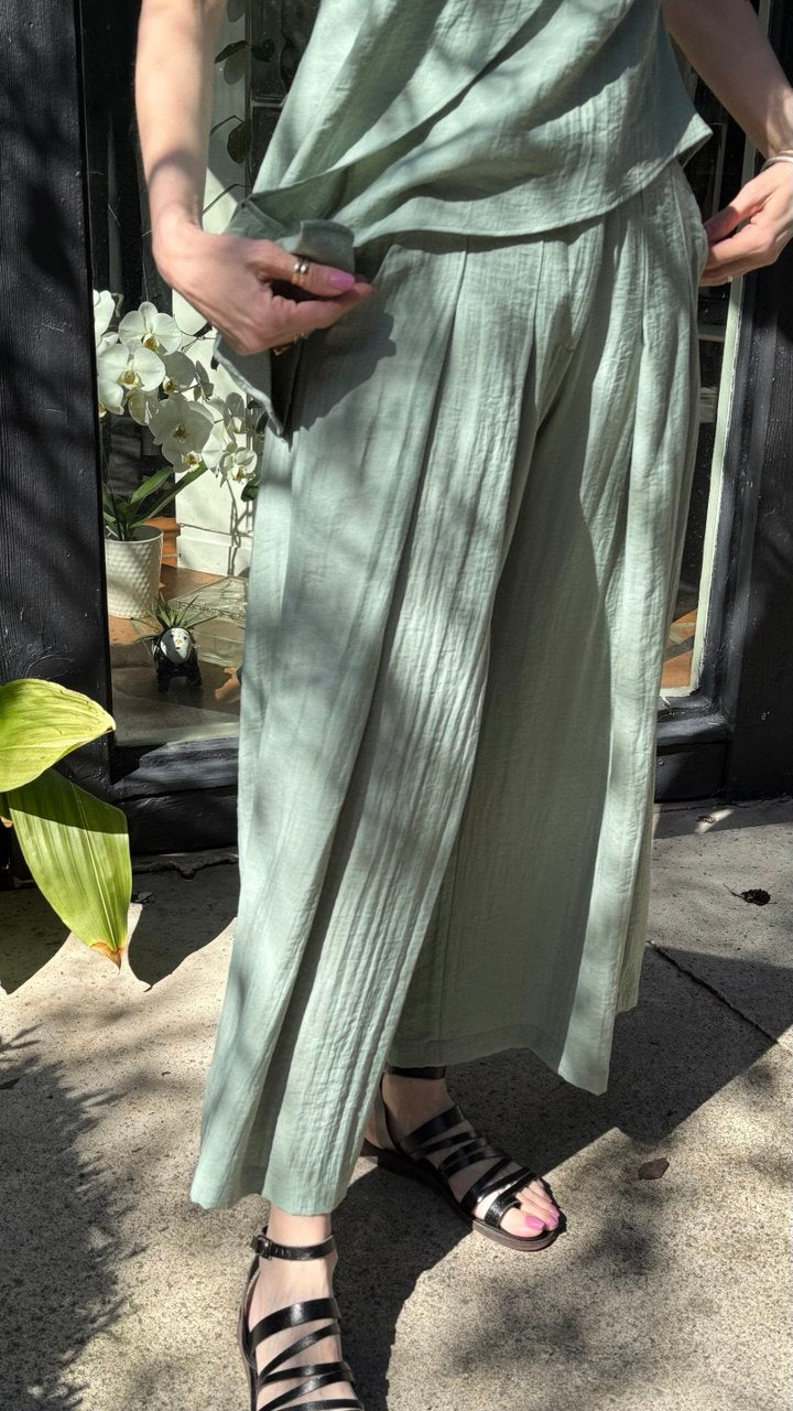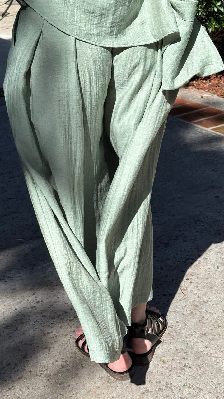 Replika's mint pleated pants deliver timeless sophistication with their full-length silhouette and refined pleated front. Crafted for versatility, these trousers transition seamlessly from professional settings to elevated casual wear. The soft mint hue offers a refreshing alternative to traditional neutrals, while the structured pleats create clean lines and a polished appearance. The full leg cut provides classic proportions that work with various footwear styles. An essential piece for building a curated wardrobe with understated elegance.