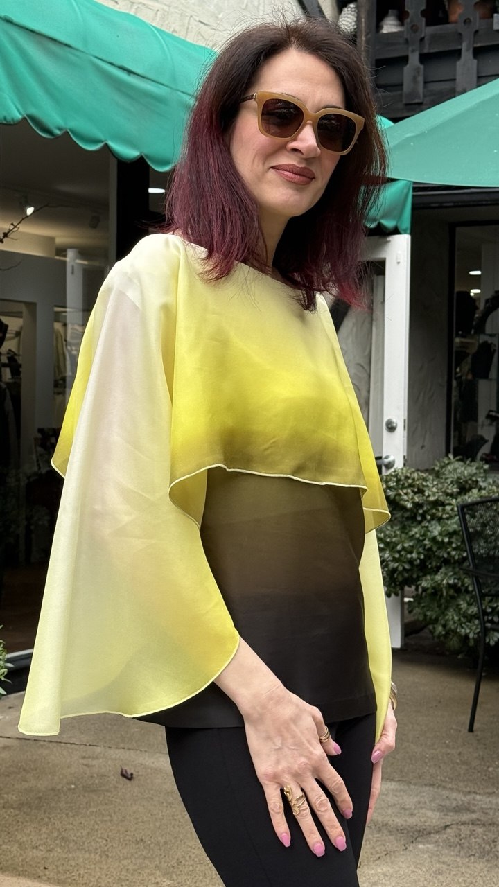 The Xenia Seat top showcases refined design through its striking ombre palette, flowing from soft pale lemon yellow at the shoulders into rich deep olive black. Constructed from breathable chiffon, this piece combines a sophisticated wide boat neckline with voluminous sleeves that layer and drape with understated grace. The relaxed, flowing silhouette delivers effortless sophistication, making it an ideal layering piece or standalone statement for versatile seasonal styling.